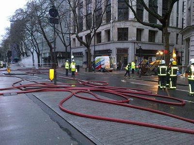 London Fire Brigade tweeted to inform commuters that part of the Kingsway was still cordoned off while firefighters tried to keep the fire contained.